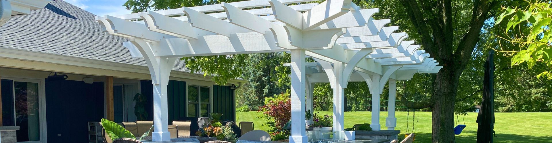This stunning outdoor space in Hawthorn Woods seamlessly blends style and functionality, creating an inviting area for relaxation and entertainment. At the heart of the design is a beautifully crafted bar and seating area, sheltered beneath a custom-built white pergola. This architectural feature not only enhances the visual appeal of the space but also provides partial shade, making it a comfortable retreat throughout the day. Are you looking to upgrade your outdoor spaces with a pond walkway, pergola, gazebo or screen house? Our team of experienced professionals are here to make all of your unique projects become reality – contact us today to start turning your outdoor dreams into reality!